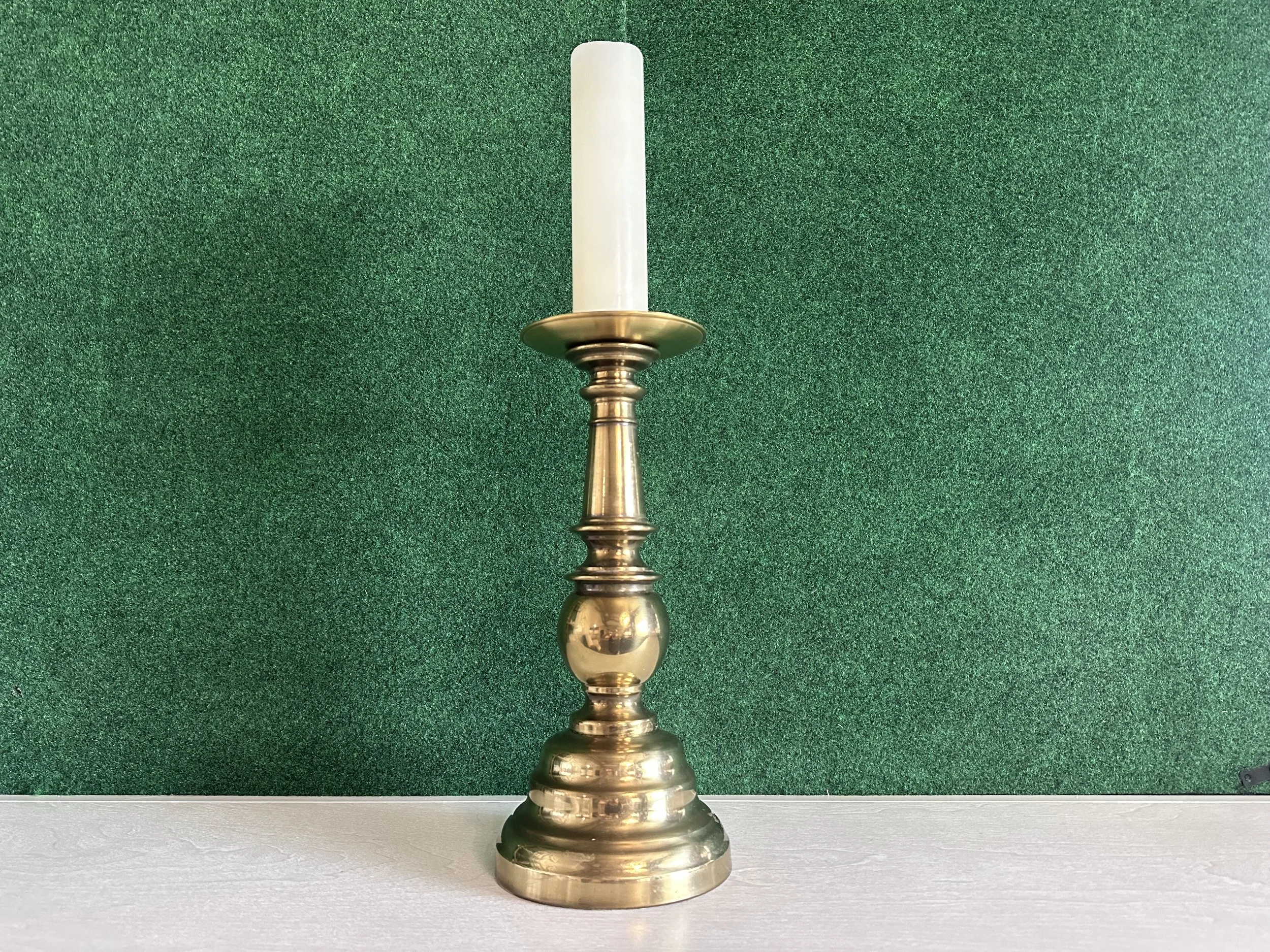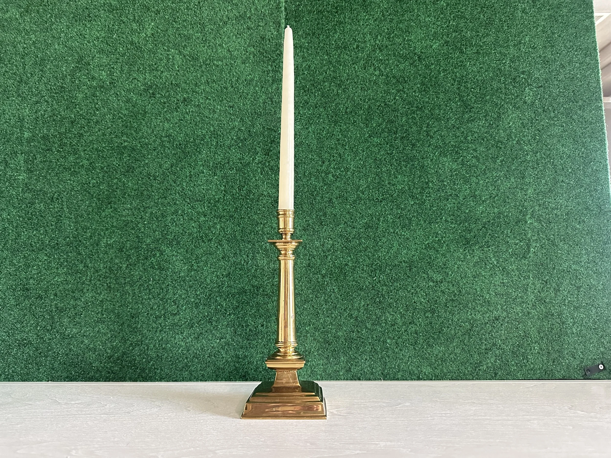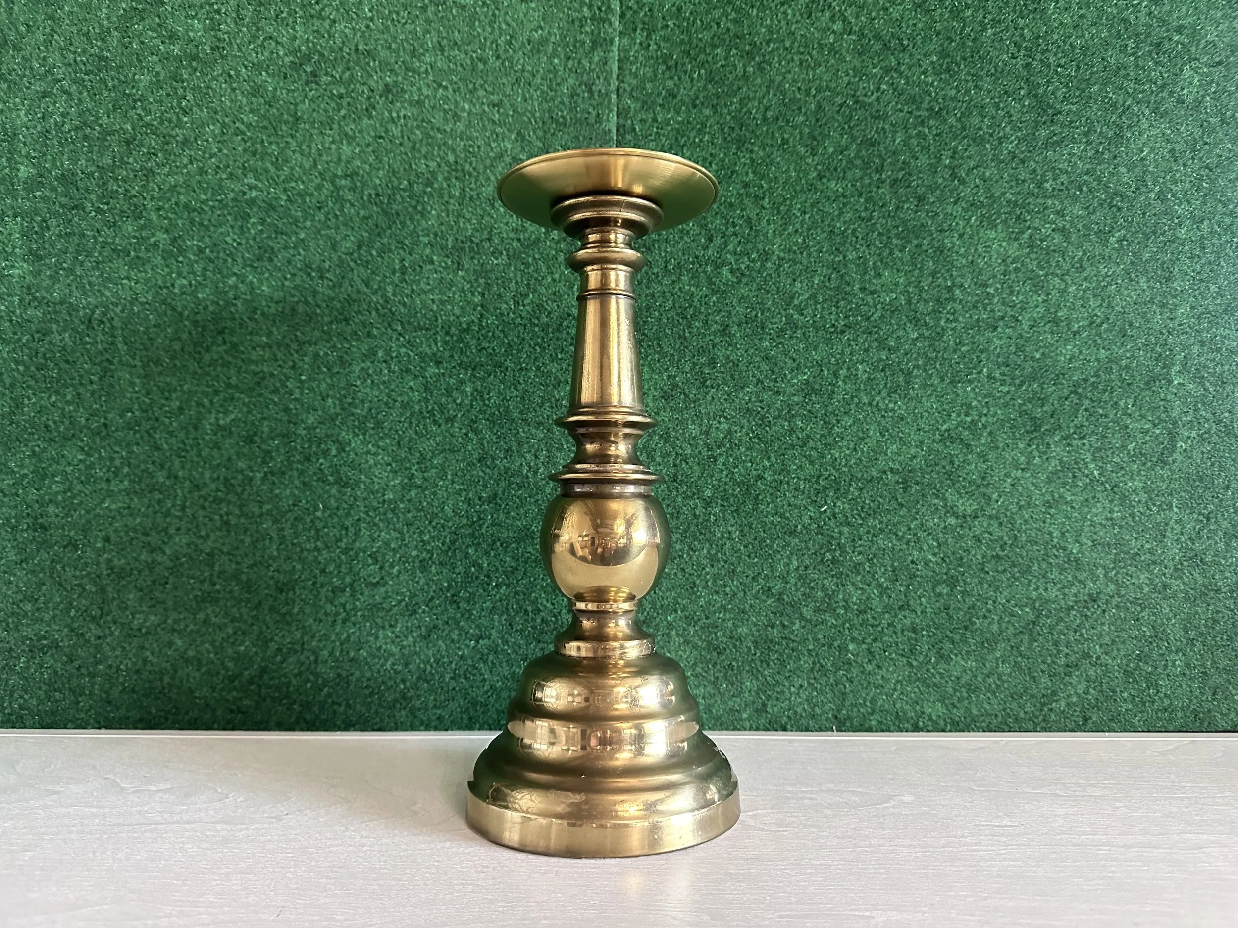 A bold statement piece—this tall column-style brass holder elevates taper or pillar candles for dramatic aisle styling, altar accents, or centerpieces.