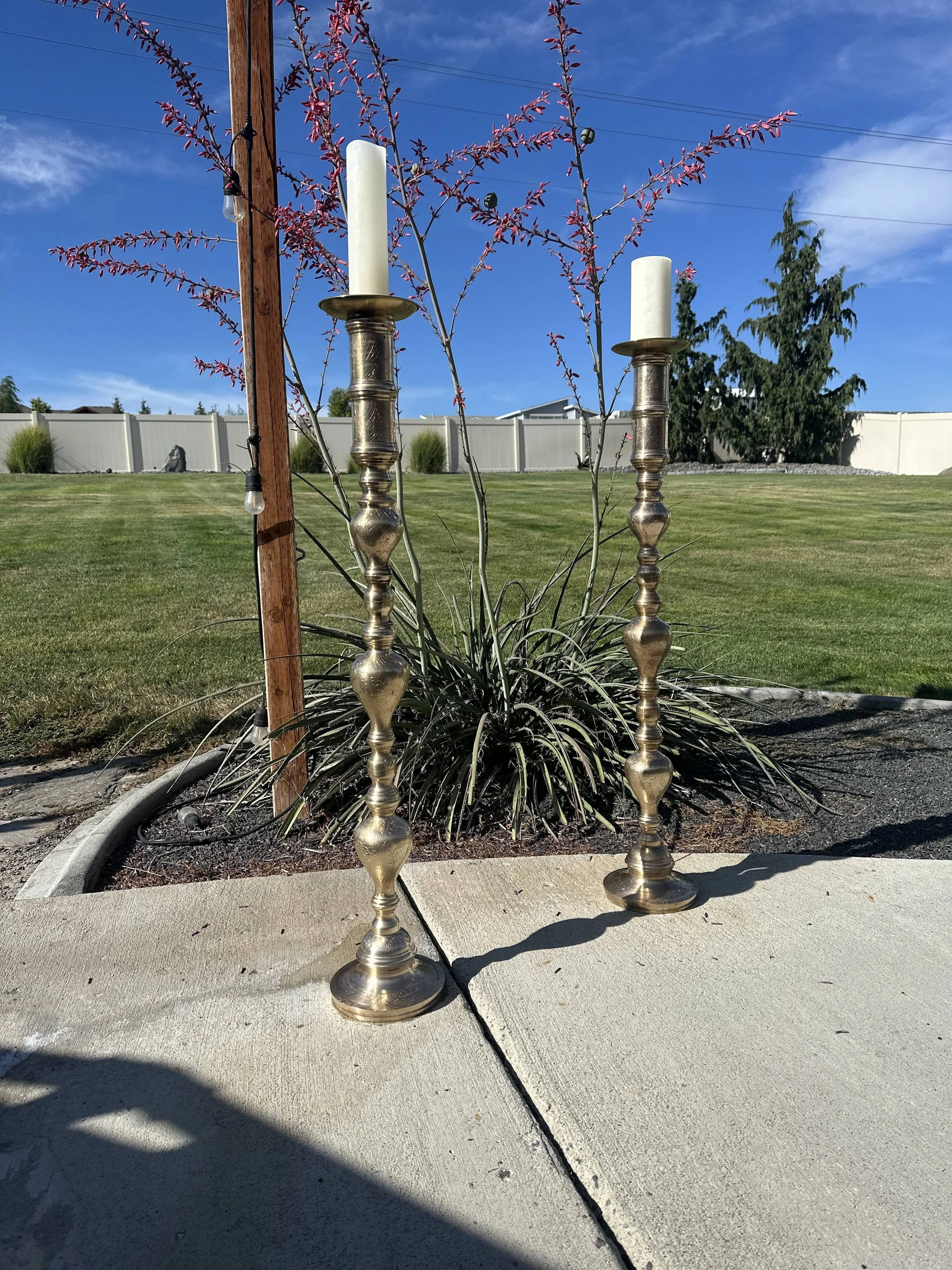 grand Vintage Altar style etched brass candle holders