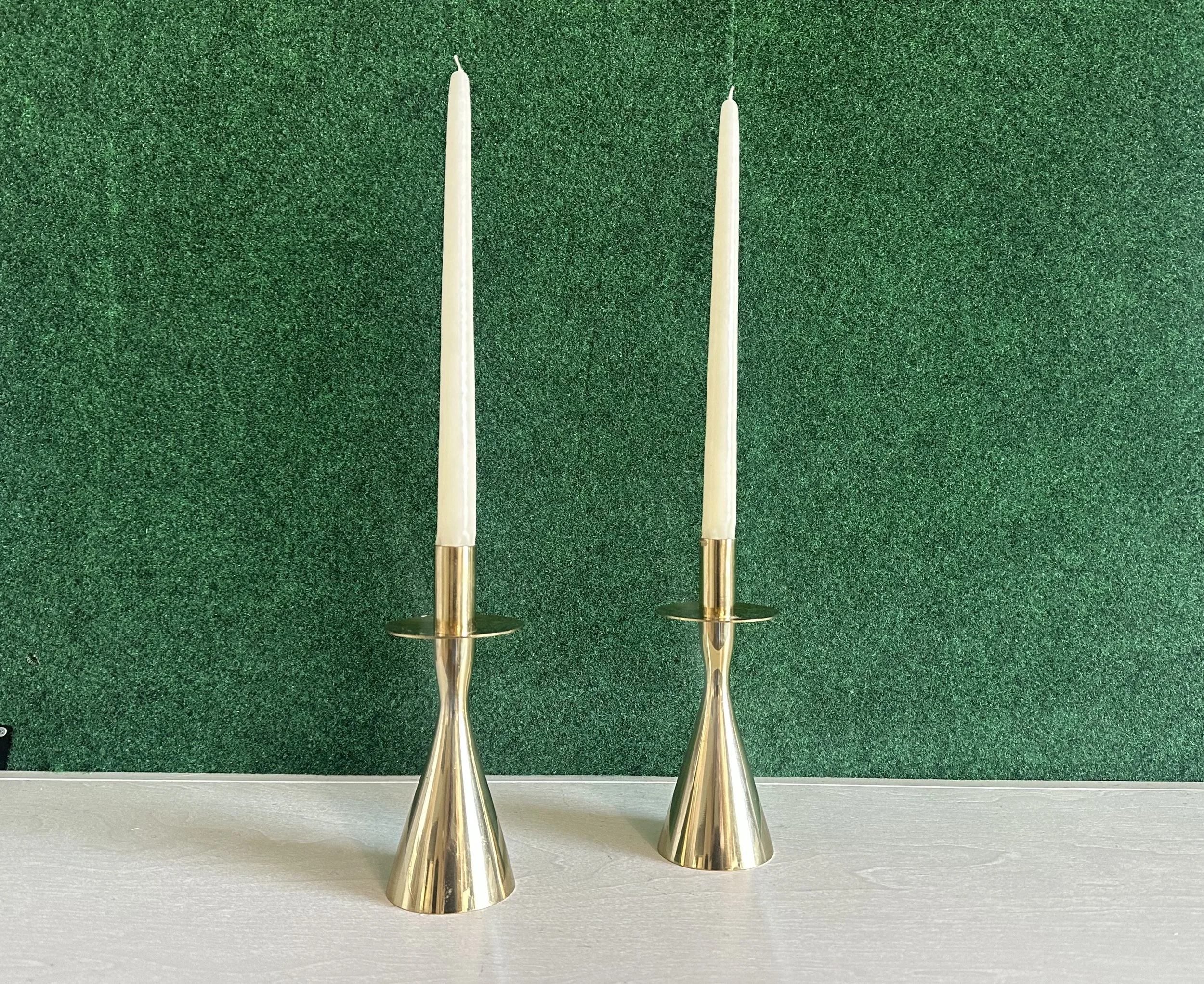 A bold pairing—this vintage brass candle holder set features wide bases for taper and pillar candles, perfect for grounding wedding tablescapes or ceremony altars with elegant shine.