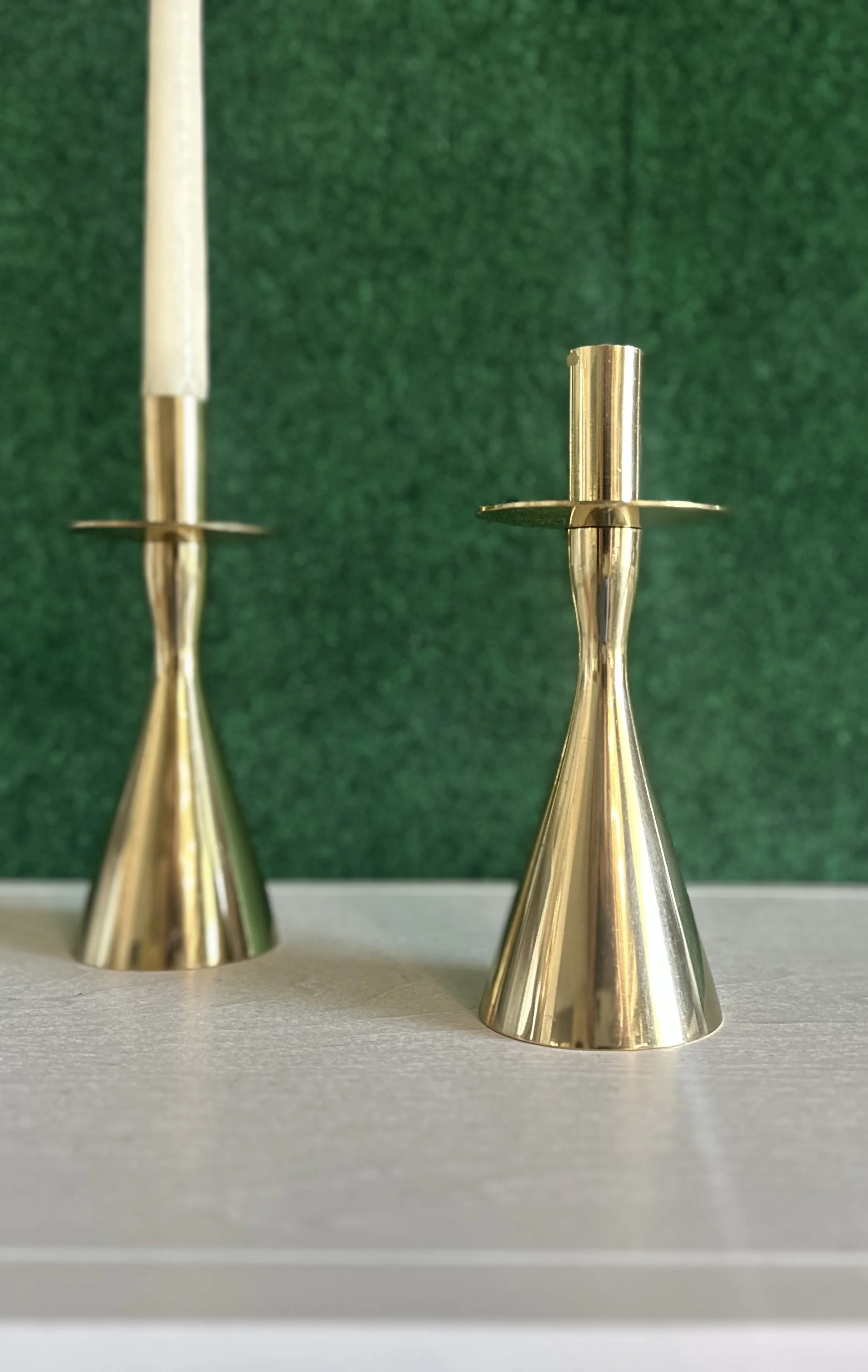 A blend of classic and petite, this brass candle holder duo brings old-world elegance to wedding tables, or styled vignettes.