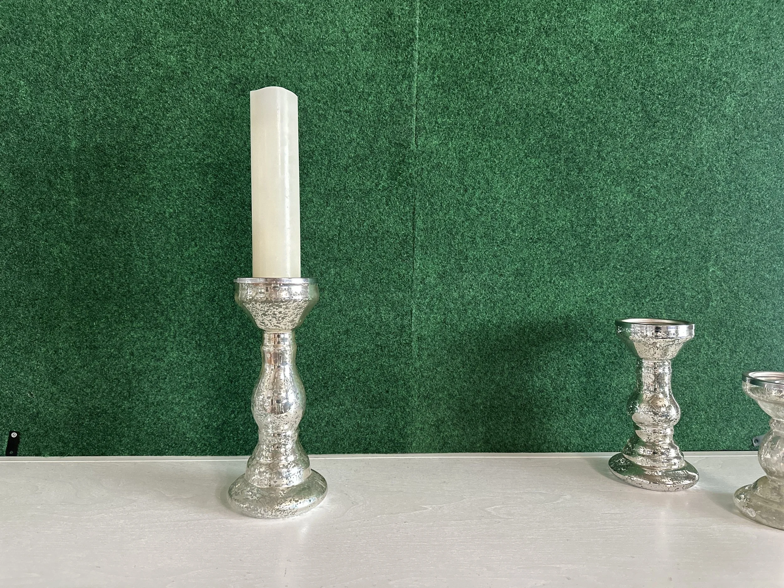 Faux silver pillar, taper, + tealight candle holder set