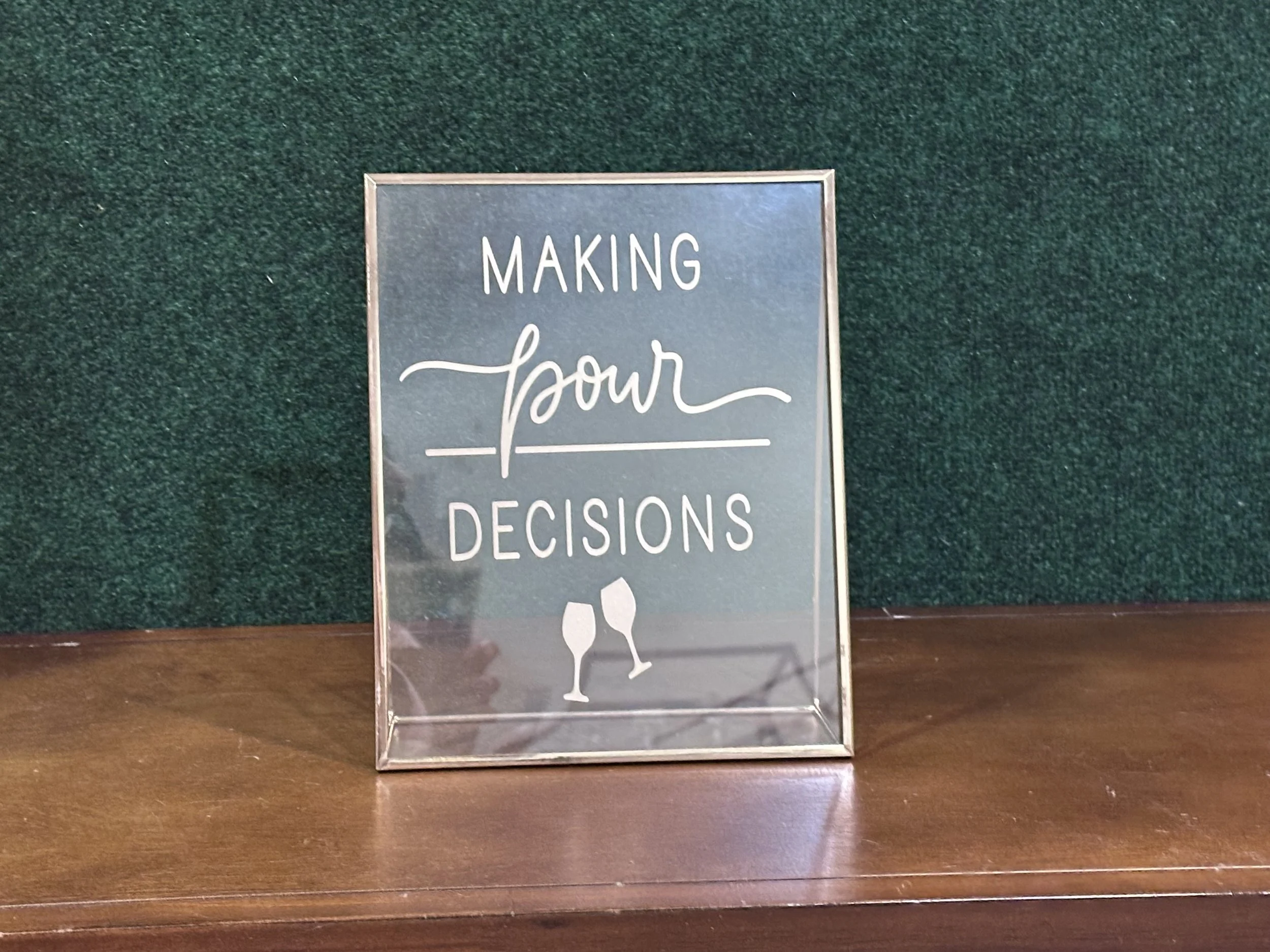 Gold self standing frame w/gold vinyl “making pour decisions”